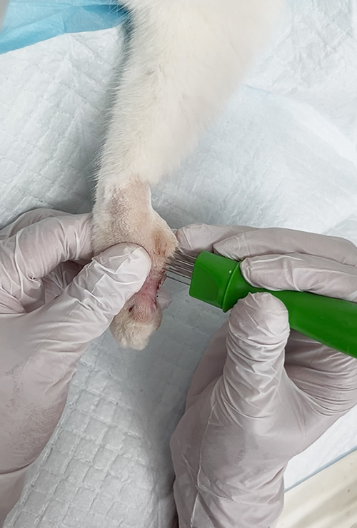 犬の場合は肥満細胞腫や扁平上皮癌、悪性黒色腫(メラノーマ)や軟部組織肉腫、棘細胞性エナメル上皮腫など、猫に関しては肥満細胞腫や皮膚扁平上皮癌で、腫瘍の縮小効果が得られたというデータが確認されています。このほかに、手術によって腫瘍を切除したあと、肉眼ではわからないレベルの腫瘍細胞が残存している可能性がある場合、再発防止のために実施することもあります。電気化学療法を施術可能な部位は今のところ体表からアクセスできる場所に限られていますが、こうした顕微鏡的病変に対する効果は、ほぼ全ての腫瘍で期待できるでしょう。